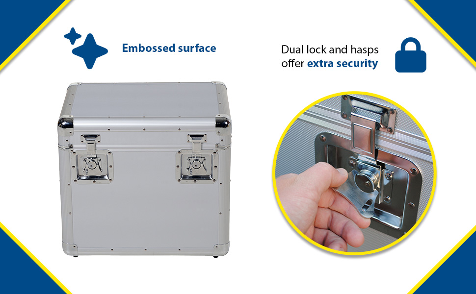 These nestable Aluminum Storage Cases keeps the contents clean and dry. Dual lock and hasps offer extra security. Durable and attractive embossed surfaced with caps on each corner to minimize damage.