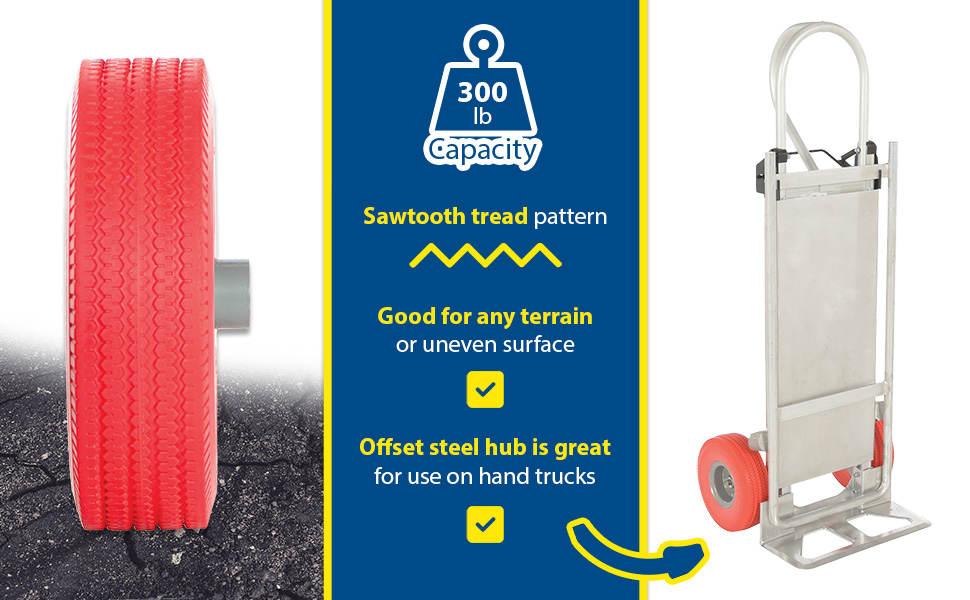 The wheel is made of polyurethane, which has a greater load-bearing capacity than rubber. These won't puncture or go flat and are resistant to corrosion and wear. The sawtooth tread pattern provides traction. This wheel is intended for use in professional and industrial environments. These urethane solid foam wheels are non-marking.