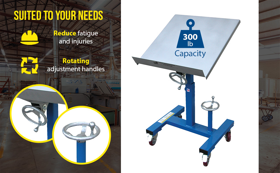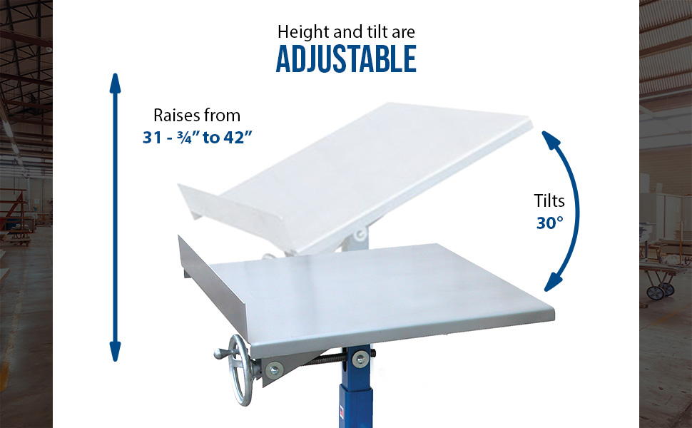 Designed to bring work to an ergonomically correct position, helping to foster a more comfortable and productive work environment. Working in a comfortable position also reduces fatigue and risk of injuries. Platform height and tilt angle are manually adjustable. Four 4" x 1-1/4" polyurethane swivel casters (two double locking) allow unit to be transported from one work area to another while loaded. All steel construction. Baked-in powder-coated toughness.