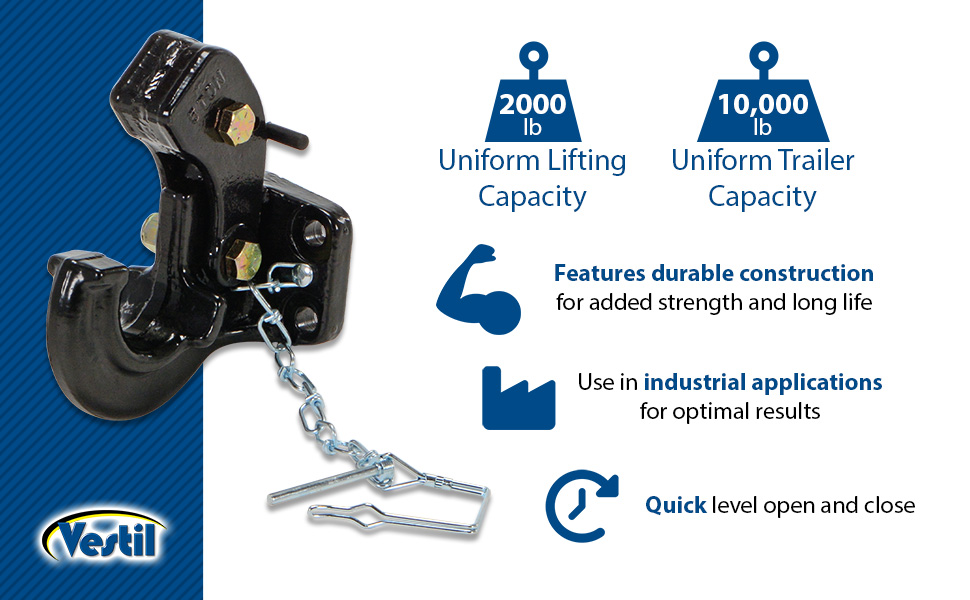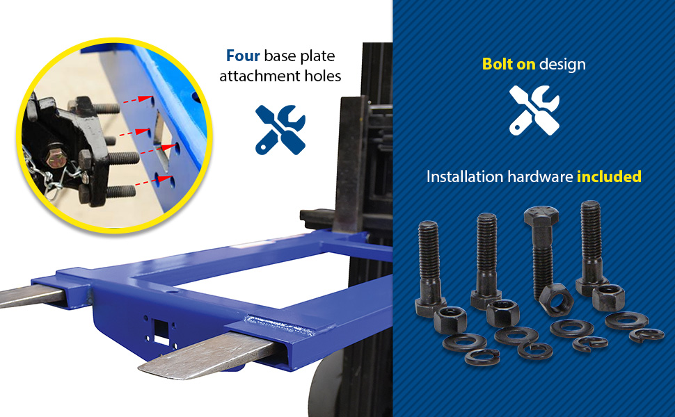 Convert your fork truck into a tow truck for moving trailers and other portable equipment. Simple design slides onto forks and secures into place with pin style tine locks and a safety restraint. Welded steel construction with blue baked-in powder-coat finish for added toughness. 5"W x 2"H usable fork pockets. Optional pintle hook, tow balls, fifth wheel trailer spotter, lifting hooks and hitch available. Bolt on design. Never exceed the 4,000 lb. capacity of the hook base. An attachment does not increase the total capacity of the unit.
