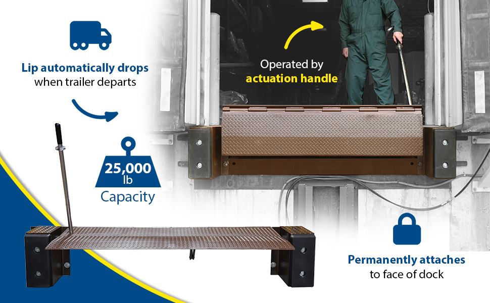 The Mechanical Edge-O-Dock is operated by placing the actuation handle into the pocket of the inner lip and pulling down toward the floor. The operator then pushes the handle forward until the lip rests on the truck bed. As the trailer departs, the lip retracts behind the bumper face automatically.