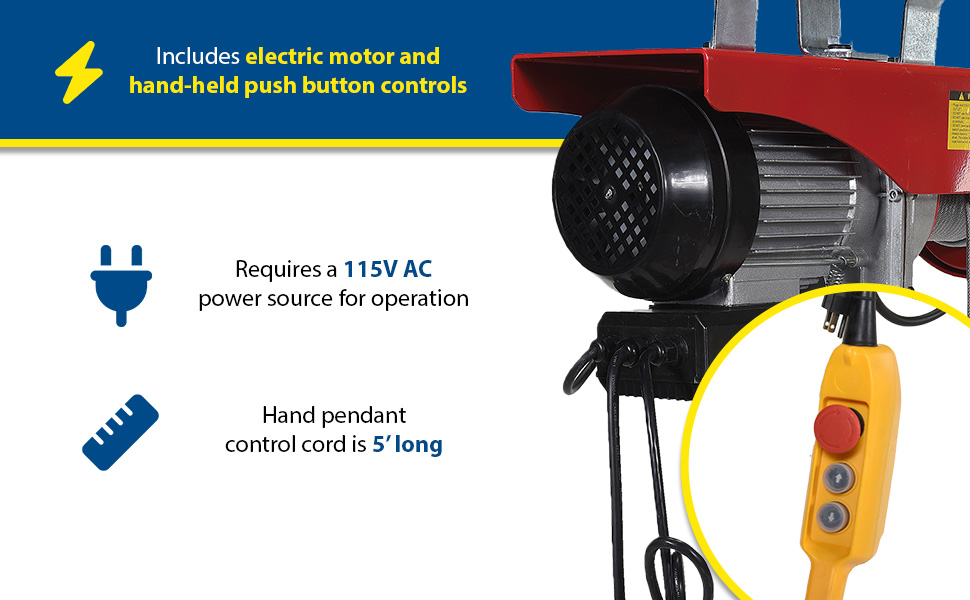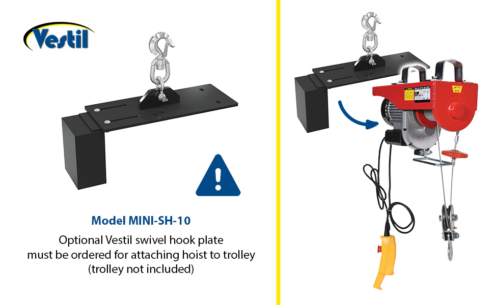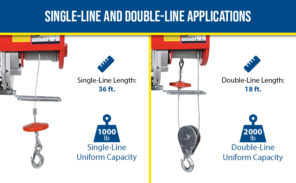Use in single-line and double-line lifting applications. Cable length is 36' when used as a single-line - 18' when used as a double-line. Includes electric motor and hand-held push button controls. Installation bracket will fit on 1-5/8" round pipe or 1-5/8" square tubing. Optional Swivel Hook Plate must be ordered for attaching hoist to a trolley (trolley not included).