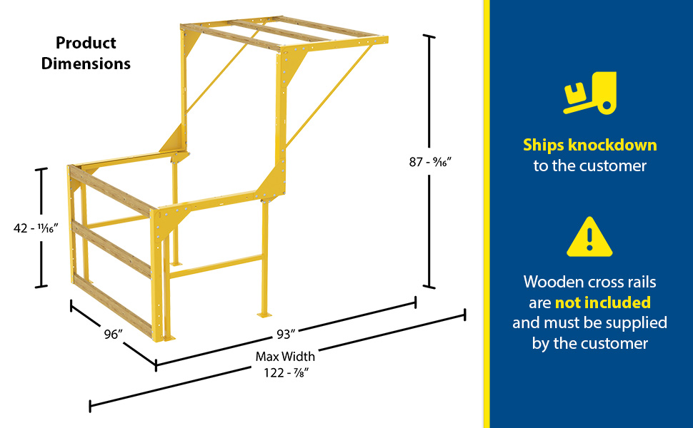 The MEZZ-KD-88T-93D ships knockdown to the customer. The 6 wooden cross rails are not included and must be supplied by the customer. Cross rails can have a maximum overall length up to 96" The MEZZ-200-BT has a bolt-together design, so the gate can be constructed, disassembled, or easily transferred to a new location. Other Mezzanine Safety Gates: Sliding Mezzanine Safety Gates | Rotating Mezzanine Gate System |
