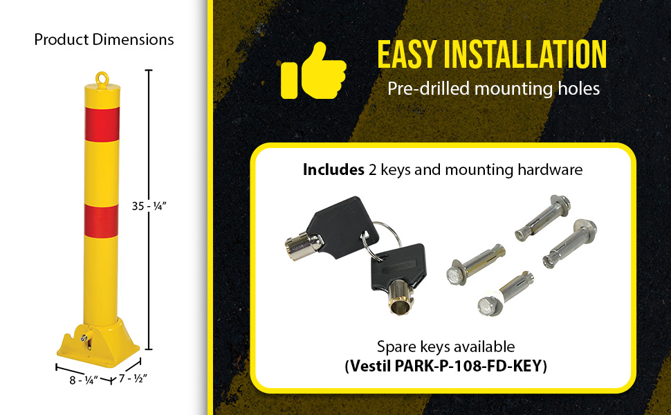Ideal for vehicle access control. These heavy duty bollards feature integrated locking and an easy to operate cam-lock. Unit secures in open position via internal lock. Two (2) keys included. Four (4) 3/8" x 3" concrete anchors included for securing bollard to concrete.