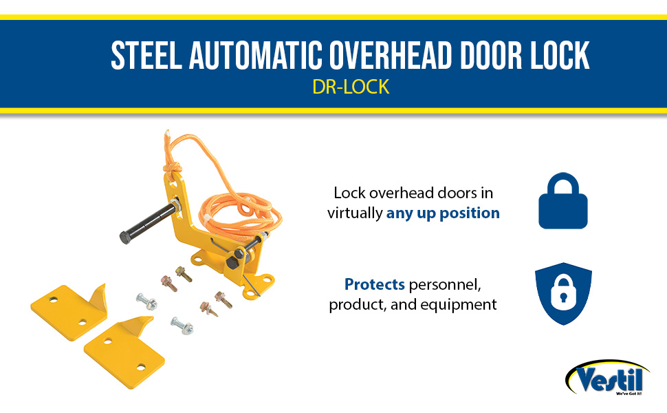 Unique product will allow overhead doors to be locked in virtually any up position. Automatically locks doors in full up position or in the closed position. Prevents the overhead door from unexpectedly "slamming down". Protects personnel, product, and equipment. Spring-loaded locking latch is released by pulling rope (included). Simply bolts to any overhead door (installation hardware is not included). Includes two reversible "locking plates" that may be mounted anywhere along door track. Steel construction with yellow baked in powder coated toughness.