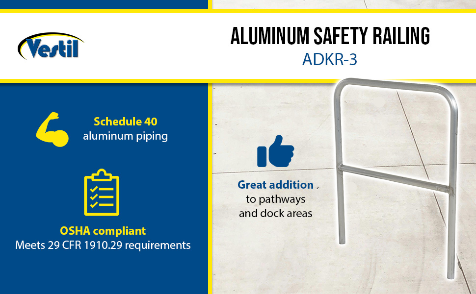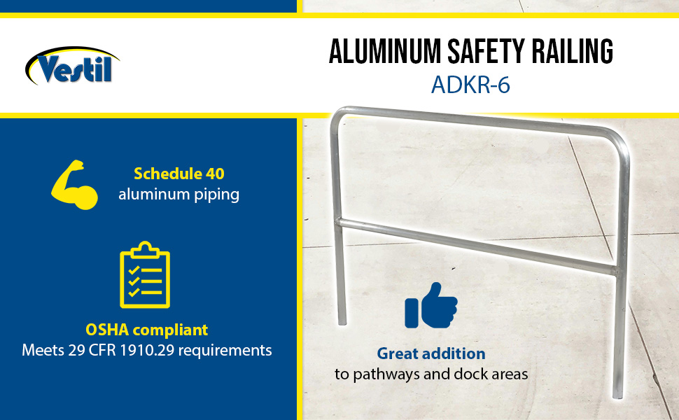Protect people from uneven walkways and mezzanine drop-off's. The safety railing is constructed of schedule 40 aluminum. All models have an outside pipe diameter of 1-5/8". Handrails are 42" high with a 21" mid-rail. Mounting options include socket sleeves, cast steel base, barricade base, or cast steel sockets for convenient handrail removal. The cast steel sockets accept 2" x 4" or 2" x 6" wood when toe boards are required. Two (2) lag down holes are pre-drilled for permanently mounting the railing. The aluminum models are available in a variety of colors. Add one of the abbreviations, found in the below table, to the end of the model number of your choice to designate the desired color. The ADKR series safety rail products comply with U.S. Occupational Safety and Health Administration (OSHA) General Industry requirements for guardrail systems in 29 CFR 1910.29.