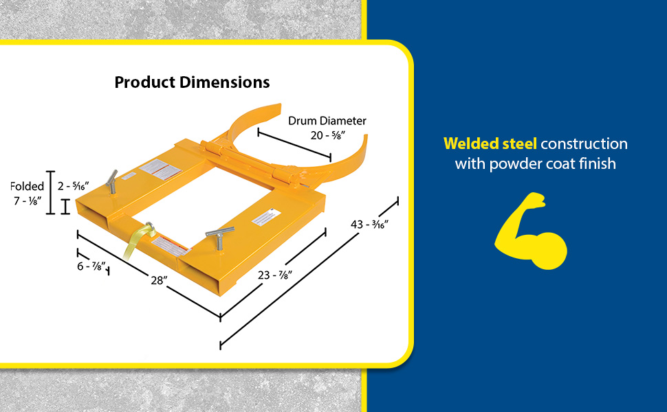 The Drum Gripper makes it easy to pick up one or two open head (with lid installed and secured) and closed head steel drums without leaving the seat of the fork truck. Simply slip the forks into the fork tubes, fasten the safety restraint and the Drum Gripper is ready to go. The knuckle gripping system is lowered around the drum, gripped tightly, and then lifted into the air. Drum is automatically released by lowering the forks. All models feature hinged folding design for storage. Safety restraint included. Welded steel construction with a baked-in powder-coated toughness.