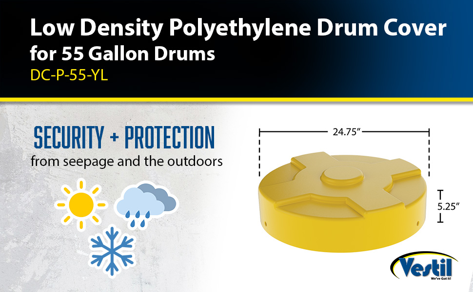 DC-P-55-UF-YL DC-P-55-UF-YLLow Density Polyethylene Drum Cover 55 Gallon Universal Fit YellowOverall Diameter (in.): 24-5/8