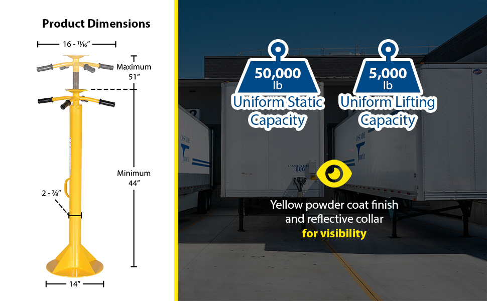 SJ-35-EF SJ-35-EFSteel Economy Stabilizing Jack with Hard Rubber Wheels 18-1/4 In. x 16-5/8 In. x 41 In. 50,000 Lb. Static Capacity YellowUniform Static Capacity (lb.): 50,000