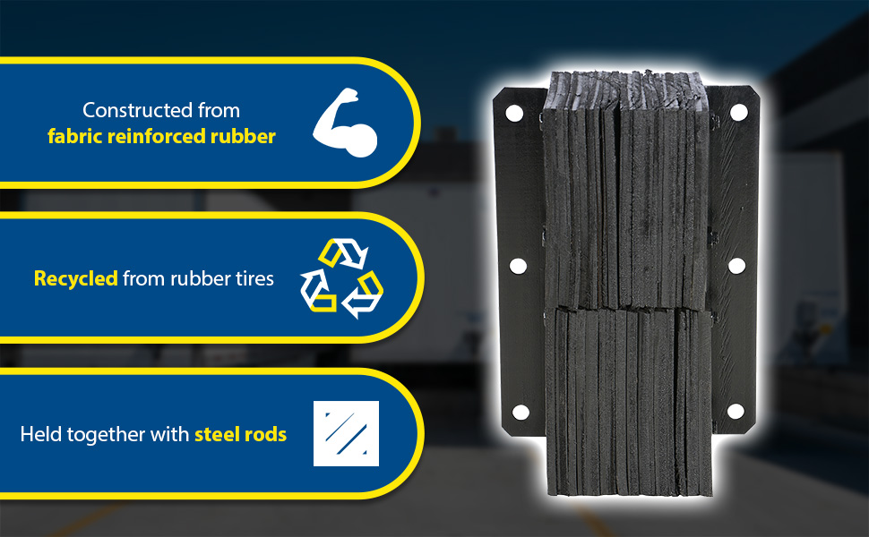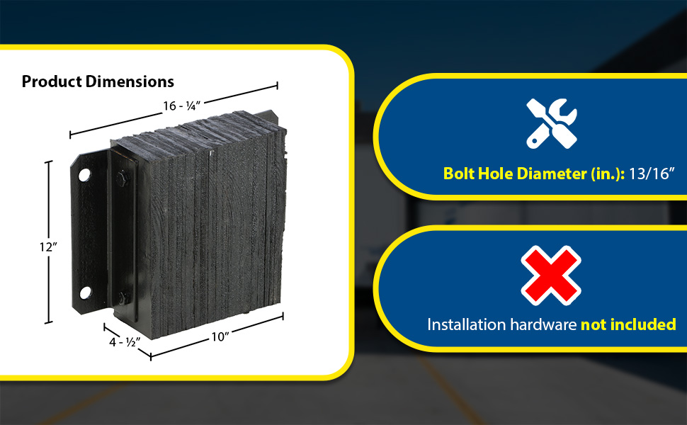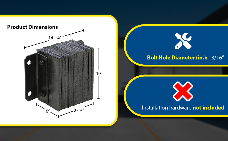 Laminated style dock bumpers provide durable, economical protection for your loading dock and trailers. Units are constructed of fabric reinforced rubber from recycled truck tires. Pads are laminated between painted structural angles and held together with 3/4" steel tie rods. A 12" long center support bracket is included with the 96" wide bumpers. Installation is quick and easy by bolting or welding units to the dock. Width is measured bolt hole center to bolt hole center, except Type C. Width is actual bolt hole center 1014-4.5F is 6", 1214-4.5F is 6-7/8". Bolt holes are 13/16" diameter on type A & C bumpers and 7/8" diameter on type B bumpers.