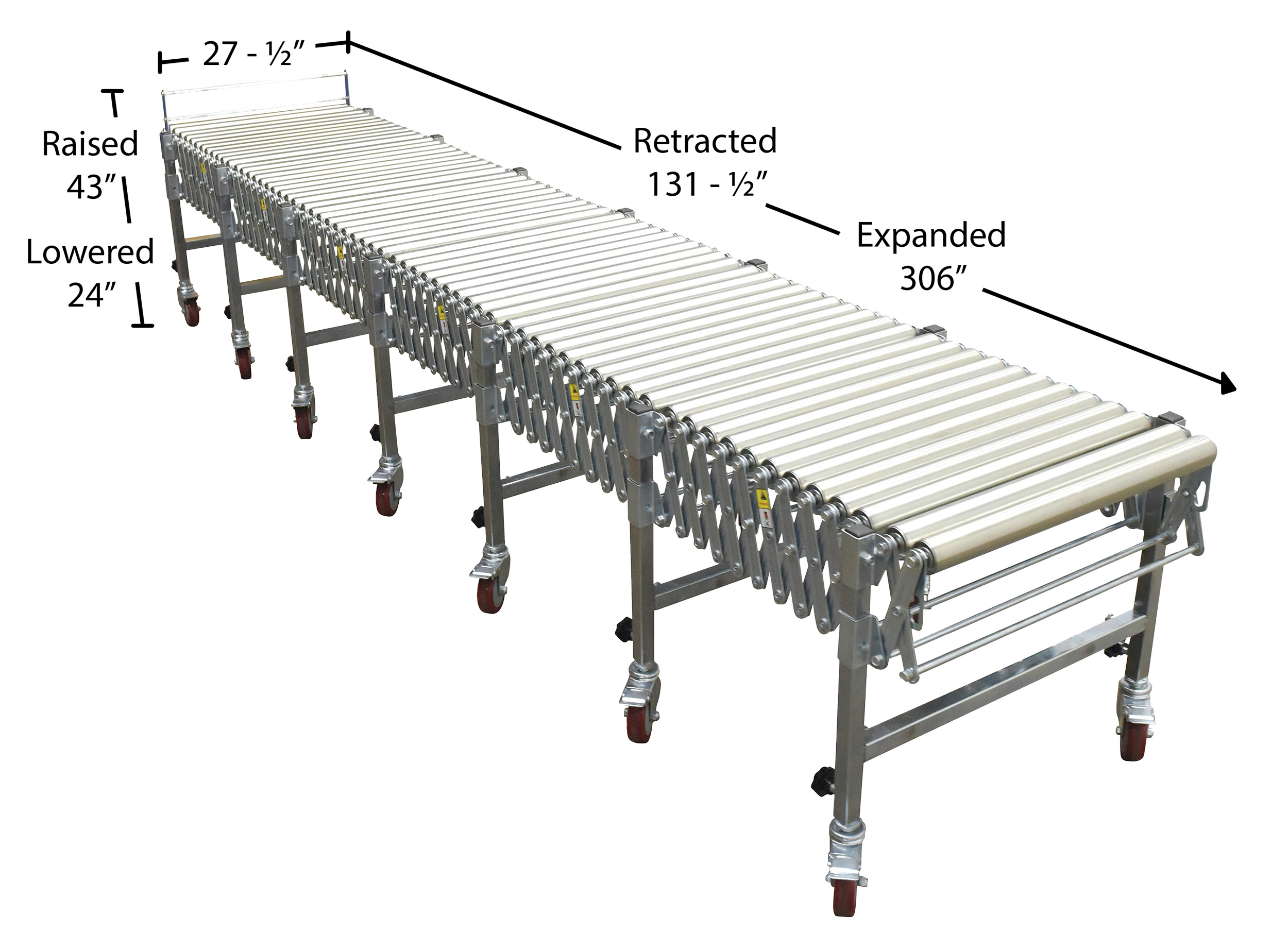 Steel Expandable Conveyor Roller 200 Lb. Capacity SilverExpandable roller conveyor is the perfect asset for packaging and distributing facilities. The conveyor provides the user an ergonomically friendly way to transfer goods while minimizing the bending and twisting during shipping and handling. A strong construction provides strength for transferring large awkward products. The conveyor can be expanded to reach greater distances between packaging points. Once finished it can be retracted to fit in a condensed area.