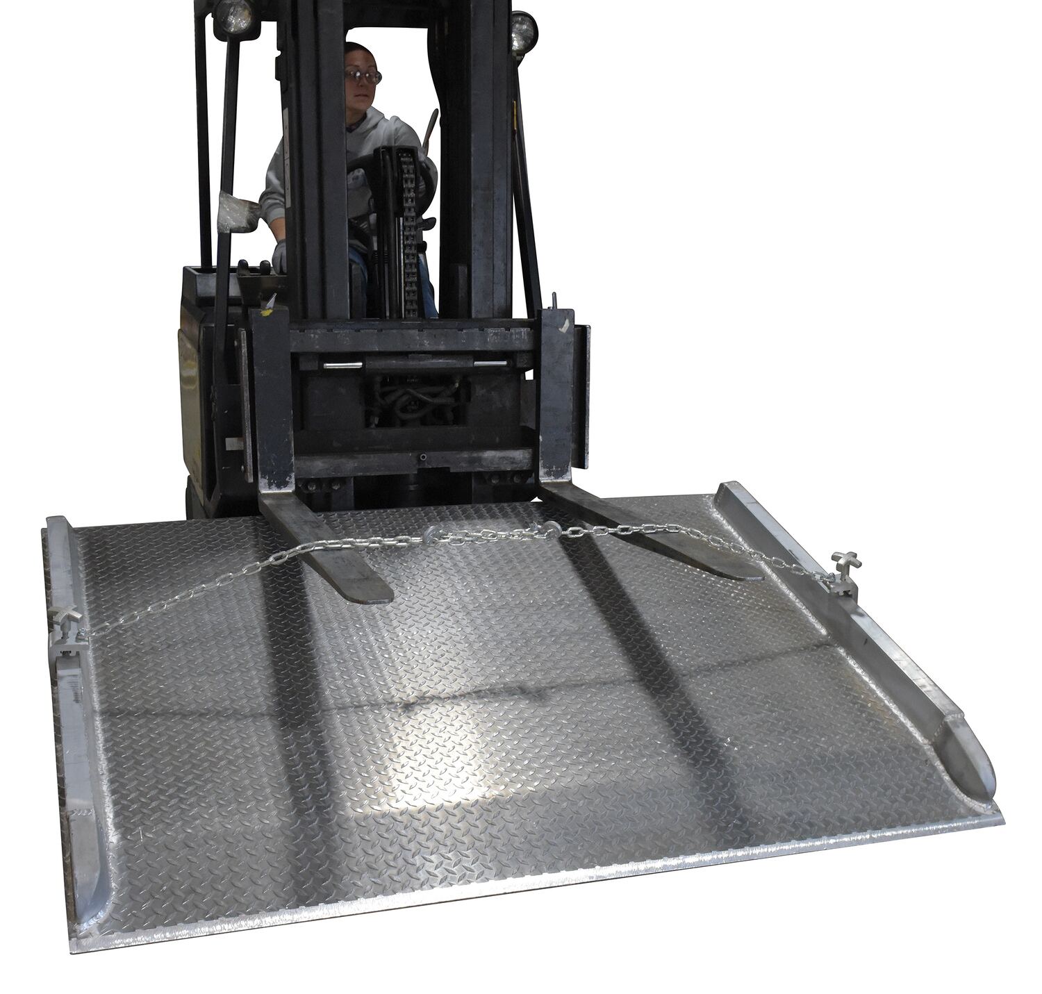 A lifting chain minimizes the manual labor associated with maneuvering heavy oversized dock boards. The chains provide a central point to be securely grasped by a lifting device, such as a fork lift. A bracket with a knob for quick hand tightening is included and can be attached to the side of a dock board to assist with the chain tightening.