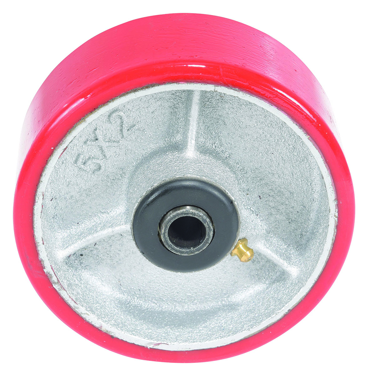 Polyurethane Wheel 5 In. Diameter x 2 In. Width Red/Silver/Black 551 Lb. CapacityPolyurethane wheels are the perfect asset for an assortment of commercial and non-commercial settings. The large capacity diminishes the number of trips needed to be taken while reducing the amount of physical labor needed to transport products. The polyurethane construction lessens the amount of noise caused through travel across rough surfaces. These casters are resistant to a variety of chemicals. Maroon tread color. Core is constructed of polyolefin.